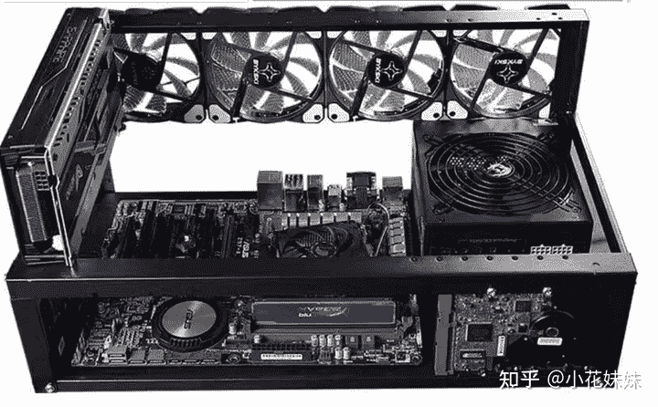 点评:拥有超高的自由对,对于家里有单独空置房间的选手可以自由发挥。并且放在中间或者较高的位置可以防止孩子宠物误碰风扇。减少了断叶和落灰的风险。主板的选择也可以选择更大的12卡主板。并且每张显卡的间距可以自由调整,可以完美解决散热问题,从此妈妈再也不担心我把家烧了。