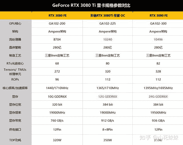 3080Ti 采用的是12GB GDDR6X规格的显存,搭载了12-pin供电,TGP功率为350W。规格方面近乎可以媲美3090,可以比作“显存减半的3090”显卡。但是和3080相比,有近乎15%-20%的硬件差距。当然这都是理论的差距,体现在游戏帧数上并不会有天壤地别的夸张程度。
